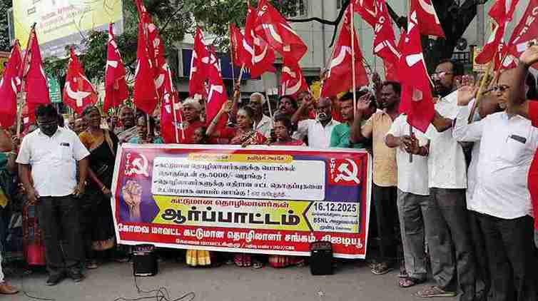 தமிழர் திருநாள் பொங்கல் பண்டிகையை முன்னிட்டு கட்டுமான தொழிலாளர்களுக்கு, நலவாரியம் சார்பில் பொங்கல் தொகுப்புடன் ரூ.5 ஆயிரம் வழங்க வேண்டும், கட்டுமான தொழிலாளர்களுக்கான ஓய்வூதியத்தை ரூ.1200 ல் இருந்து ரூ.3 ஆயிரமாக உயர்த்தி வழங்க வேண்டும், உள்ளிட்ட கோரிக்கைகளை வலியுறுத்தி சிஐடியு கோவை மாவட்ட கட்டுமான தொழிலாளர் சங்கத்தினர், கோவை பி.எஸ்.என்.எல் தலைமை அலுவலகம் முன்பு கண்டன ஆர்ப்பாட்டத்தில் ஈடுபட்டனர். அப்போது உடனடியாகத் தமிழ்நாடு அரசு கட்டுமான தொழிலாளர்களின் கோரிக்கைகள்மீதுஉரிய நடவடிக்கை எடுக்கக் கோரி கண்டன கோசங்களை எழுப்பினர்.