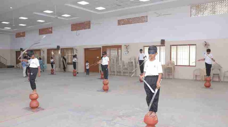 வரிசையாக வைக்கப்பட்ட பானைகள் மீது நின்ற சிறுவர், சிறுமிகள் சிலம்பம், சுருள் வாள், மான் கொம்பு மற்றும் வாள் வீச்சை தொடர்ந்து 4 மணி நேரம் செய்தனர்.